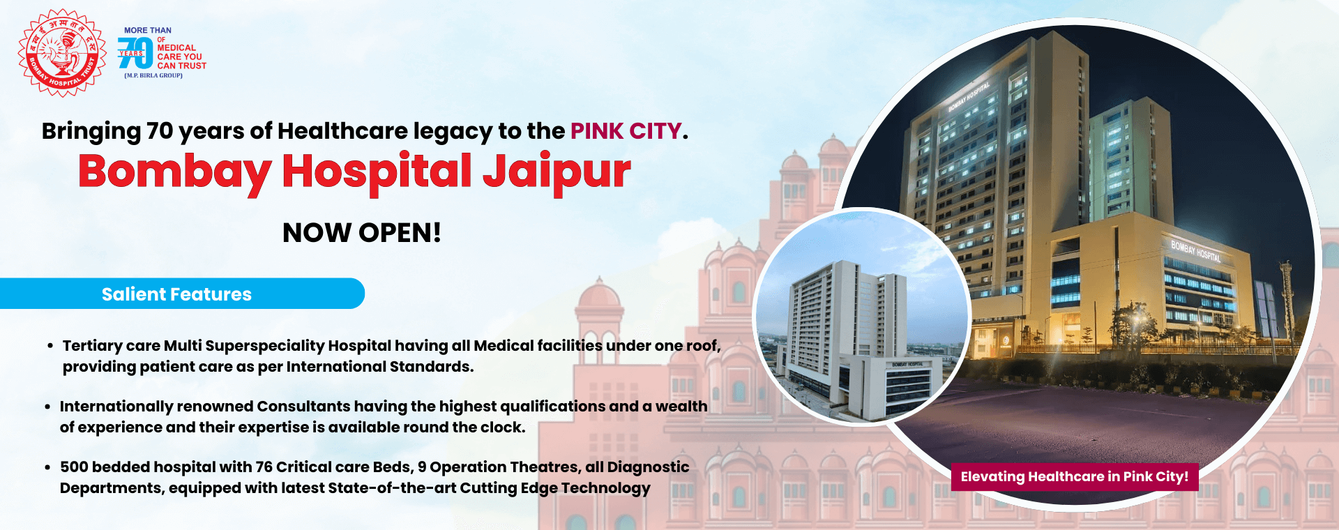 Established over seven decades ago, in 1952, The Bombay Hospital was the result of the enormous philanthropy displayed by Shri Rameshwardas Birla, Founder Chairman of the Bombay Hospital Trust. It began as a 440 bed hospital whose objective was, in its founder’s words, “to render the same level of service to the poor that the rich would get in a good hospital.”