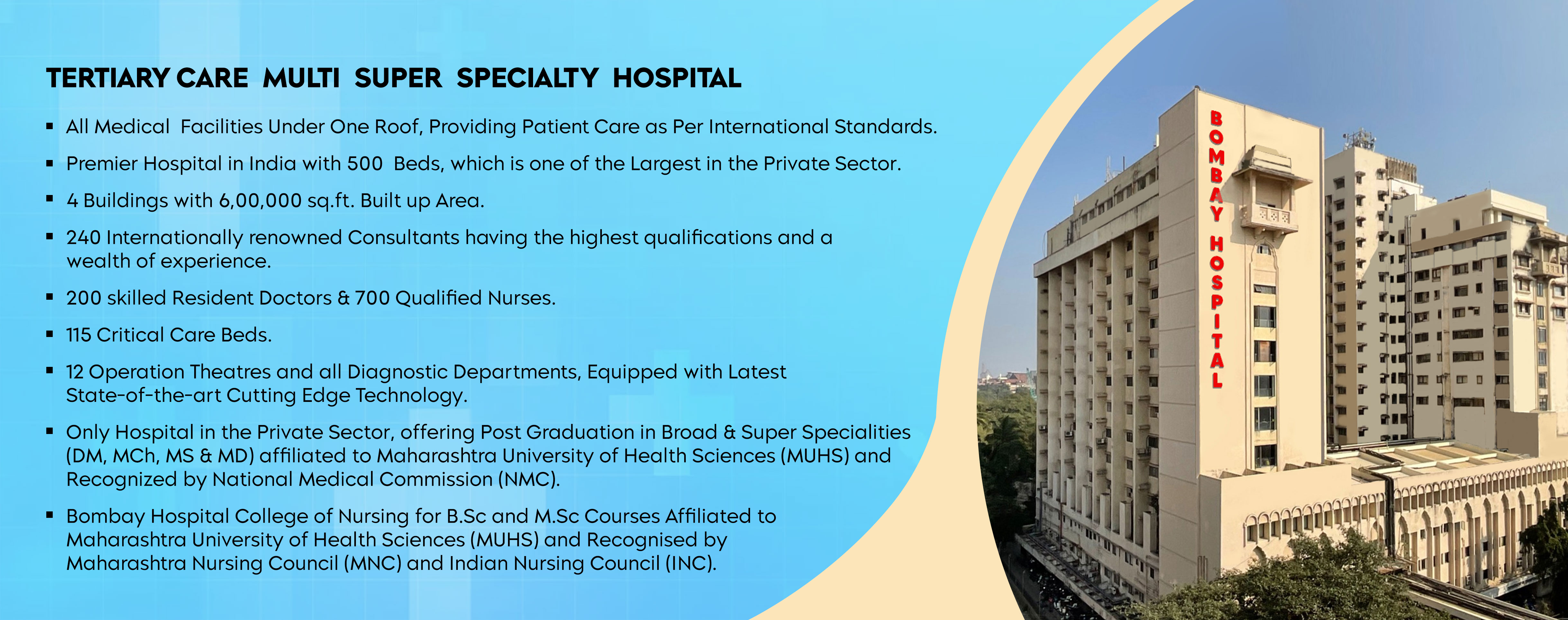 Mumbai, the centre for quality medical care not only across India, but also the South Asia. A city that has a rich medical history. Situated in South Mumbai is the Bombay Hospital and Medical Research Centre, the medical hub of India’s biggest metropolis.
