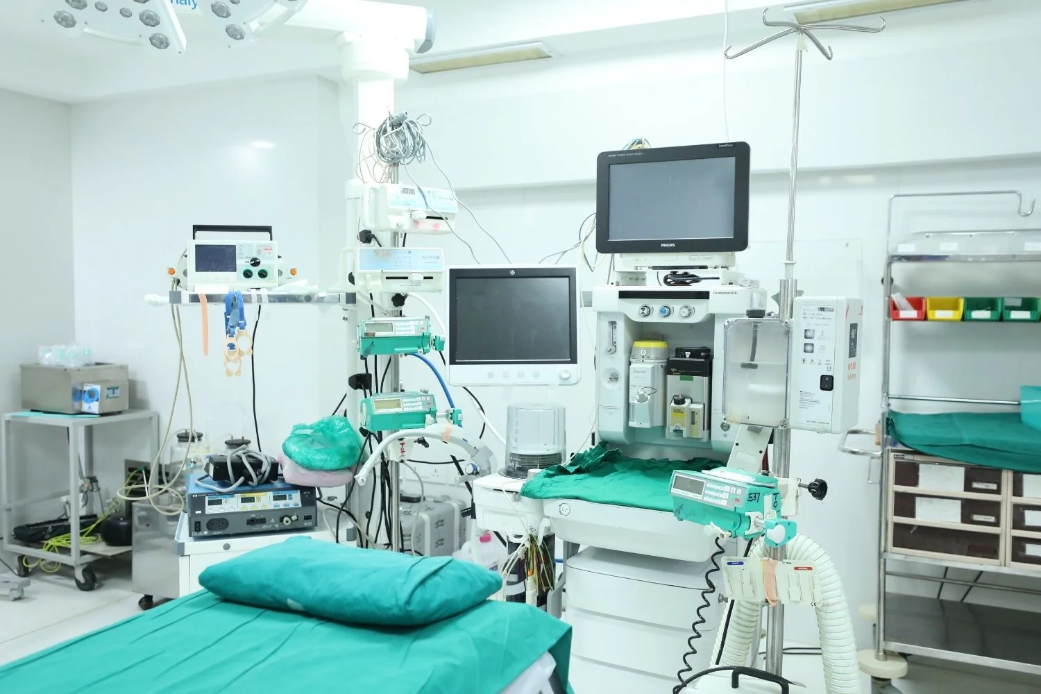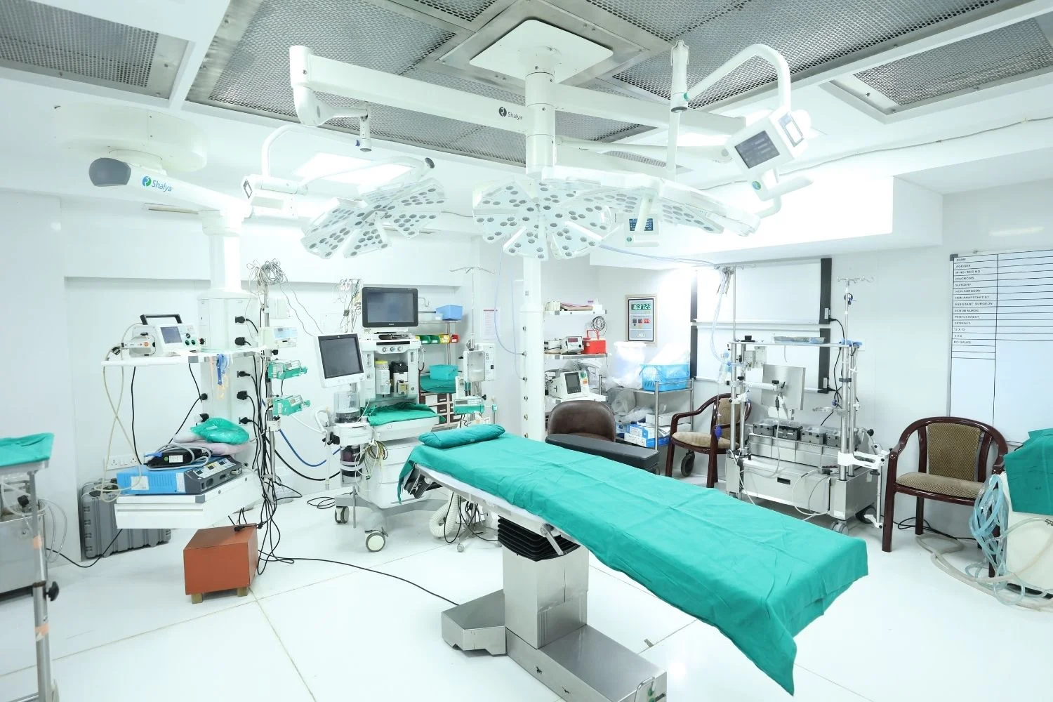 Strict aseptic precautions and a sterile atmosphere is maintained with continuous airflow filtered by HEPA filters in all theatres. The universally proven Ohmeda Excel 210 SE, the 5250 RGM Respiratory Gas Monitor, H P Monitors and Siemens ventilators complete the anesthesia workstation.